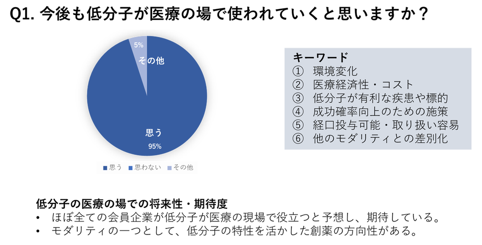 【寺坂】:まず、「今後も低分子が医療の場で使われていくと思いますか?」という質問に対しては、ほぼすべての会員企業が「思う」と回答し、期待の高さを感じ取ることができました。モダリティの一つとして、低分子の特性を活かした創薬の方向性があるという認識です。この点についてご意見をお聞かせください。